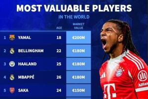 24直播网讯 德转发布2025/26赛季最新球员身价榜。亚马尔以2亿欧身价登顶,贝林厄姆、哈兰德、姆巴佩并列第二。多位英超球员入选,包括萨卡、维尔茨、帕尔默、赖斯等,但英超球员身价更新将于明日进行。