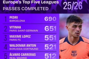 五大联赛球员传球榜:佩德里690次居首,维蒂尼亚651次次之