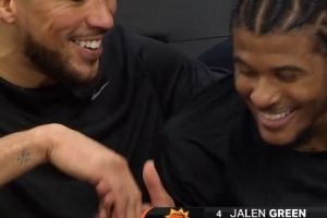 终于等到你!布克在板凳席给杰伦·格林捏肩膀 两人有说有笑