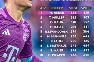 24直播网讯 在德甲国家德比中,拜仁2-1战胜多特。门将诺伊尔以530场德甲比赛、363场胜利的纪录,超越穆勒成为德甲历史胜场王,荣登榜首。