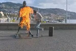 此前该男子在个人社媒晒出视频,点火烧位于丰沙尔海洋大道CR7博物馆旁的C罗雕像,随后还对着镜头跳舞和比划。
