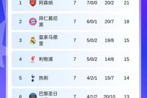 欧冠第7轮积分榜:红军升第4 切尔西升第8 巴萨升第9,曼城跌第11