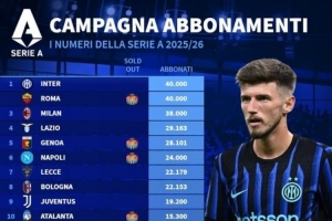24直播网讯 2025-26赛季意甲季票销售榜出炉,国际米兰与罗马以4万张并列榜首,AC米兰以3.8万张紧随其后。传统强队尤文图斯仅售出1.92万张,排名第九。榜单显示,北方三强依然占据销售前列,但整体竞争格局有所变化。