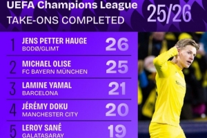 本赛季欧冠成功过人榜:海于格26次居首,奥利塞第二,亚马尔第三