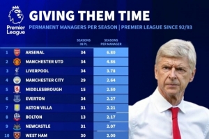 德转列英超各队主帅平均执教时长排行榜(球队至少在英超征战13个赛季)