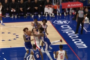 是个好防守!申京篮下强打恩比德造犯规 76人挑战成功
