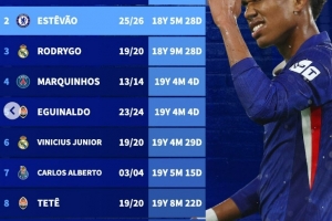 24直播网讯 欧冠改制后巴西最年轻进球球员榜单出炉。恩德里克(18岁1月27天)居首,切尔西新星埃斯特旺(18岁5月28天)位列第二,罗德里戈、马尔基尼奥斯等巴西新星也榜上有名。