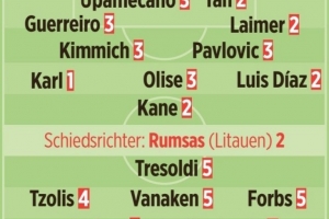 卡尔1分、基米希3分、奥利塞3分、帕夫洛维奇3分、迪亚斯2分