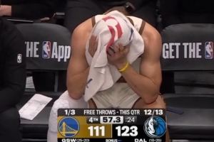 GIF-勇士垃圾时间 库里在替补席用毛巾捂脑袋 眼神空洞
