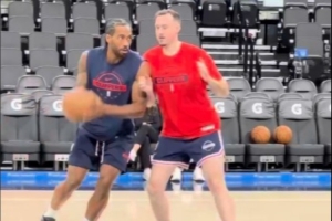 看脚踝情况怎样!小吧现场直击:出战成疑的小卡赛前训练突破上篮