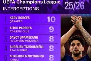 本赛季欧冠拦截榜:于帕梅卡诺&琼阿梅尼各8次,加拉格尔7次