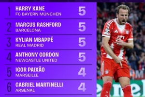 本赛季欧冠参与进球榜:凯恩、拉什福德、姆巴佩等四人同以5球并列榜首