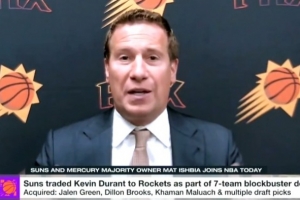 24直播网讯 太阳老板伊什比亚评价与火箭的交易,称杜兰特不适合球队未来发展方向,但满意换回的球员,包括意志坚强的狄龙·布鲁克斯、潜力新星杰伦·格林及多个选秀权。他表示球队将展望未来,不沉湎过去,对菲尼克斯的未来发展感到乐观。