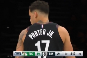 真是自信!小迈克尔·波特踩着logo坚决出手 加长三分空心命中!