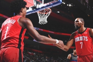 正负值最高二人组!火箭赢球海报:封面为杜兰特+阿门击掌瞬间