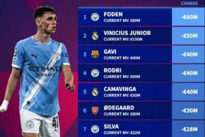 2025年身价跌幅榜:福登6000万欧居首,维尼修斯5000万欧次席