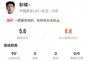 彭啸本场8长传3成功+5解围 3对抗0成功+1拦截1犯规 获评5.6分