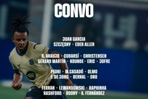 24直播网讯 巴萨公布西甲客战奥维耶多大名单,莱万领衔锋线,小将德罗入选。亚马尔因故缺席。门将什琴斯尼在列,后防由阿劳霍、孔德领衔,中场佩德里、德容坐镇,前锋线还有拉菲尼亚、拉什福德等。