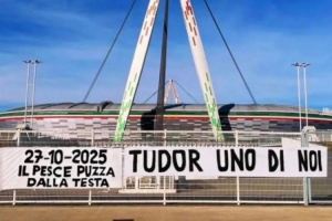 24直播网讯 尤文主帅图多尔遭解雇后,球迷强烈抗议。球迷在主场外悬挂横幅,一条意大利语谚语“鱼从鱼头开始发臭”直指俱乐部高层是问题根源;另一条则声援图多尔,称他为“我们中的一员”,明确表示球队危机源于领导层而非教练席。