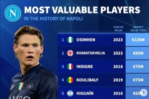 24直播网讯 德国转会市场公布了那不勒斯队史身价前十球员。奥斯梅恩以1.2亿欧高居榜首,克瓦拉茨赫利亚(8500万欧)和因西涅、库利巴利(均为7500万欧)紧随其后。榜单中,多名球员身价超5000万欧,反映了那不勒斯近年来的阵容实力与市场价值。