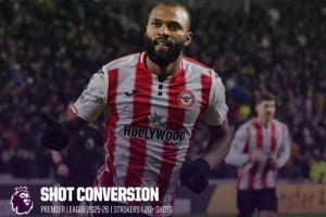 本赛季英超射门转化率榜:蒂亚戈居首,维尔贝克次席,哈兰德第四
