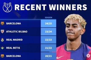 体育资讯10月29日讯 《转会市场》统计了近10年国王杯夺冠情况,巴萨5次夺冠居首。