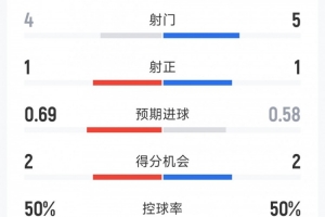 切尔西1-0水晶宫半场数据:射门5-4,射正1-1,得分机会2-2