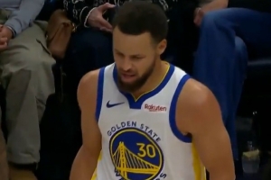 次节刚打!库里顶着防守干拔三分终于命中 个人本场首记三分