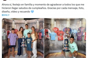 苏亚雷斯迎来39岁生日,他在社交媒体上晒出与家人一起庆祝生日的照片,并写道:“现在终于可以和家人一起庆祝生日了,也借此机会感谢所有给我送上生日祝福的人!感谢你们的每一条信息、每一张照片、每一个设计、每一段视频和每一份美好回忆!”