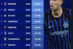 意甲中卫税前年薪排行:巴斯托尼1020万欧元居首,前四国米三席