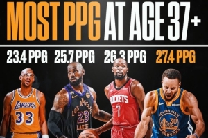 本赛季库里场均27.4分 是37+岁球员单赛季历史最高 本赛季KD第2