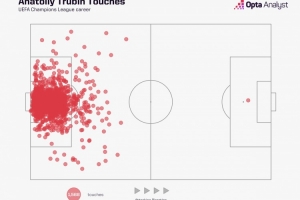 特鲁宾欧冠生涯触球1568次,首次在对方半场触球就攻入关键进球