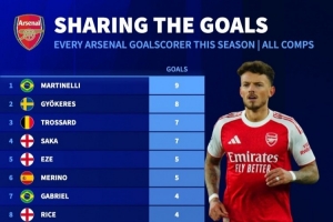 多点开花!阿森纳本赛季16人取得进球,马丁内利打进9球最多