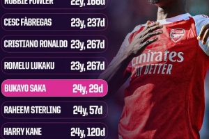 24直播网讯 阿森纳球员萨卡在对阵西汉姆的比赛中破门,达成英超直接参与100球里程碑。他以24岁29天的年龄,位列英超历史达成此成就最年轻球员第7位,仅次于欧文、鲁尼等传奇球星。