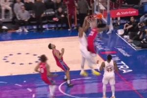 这球是真的炸裂!亨特快攻中骑扣恩比德 大帝被扣翻在地