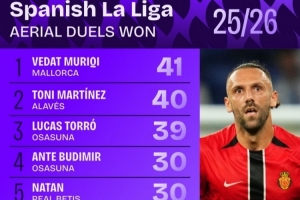 24直播网讯 Squawka统计本赛季西甲争顶成功次数,赫伊森以21次位列第八。榜首为马洛卡的穆里奇(41次),阿拉维斯的马丁内斯(40次)和奥萨苏纳的托罗(39次)紧随其后。奥萨苏纳共有三人上榜,展现了球队在空中争抢的优势。