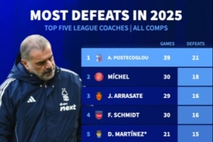 24直播网讯 诺丁汉森林主帅波斯特科格鲁接手后球队表现更差,他成为五大联赛本赛季输球最多的教练,达21场。在最新统计中,他位列五大联赛主帅输球场次榜首,领先其他教练。