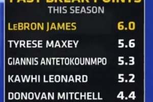 本赛季场均快攻得分Top5:詹姆斯、马克西、字母哥、小卡、米切尔