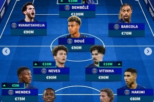 24直播网讯 德转发布法甲球员身价最高阵容,巴黎圣日耳曼球员包揽全部11席。门将舍瓦利耶4000万欧,后卫线阿什拉夫(8000万欧)领衔,中场内维斯、维蒂尼亚、杜埃及前锋克瓦拉茨赫利亚四人同为9000万欧,登贝莱以1亿欧身价成为标王。