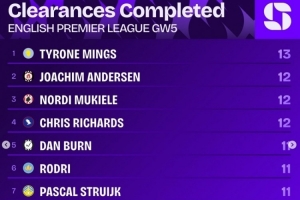 体育资讯9月24日讯 英超第5轮战罢,squawkafootball列各项数据排行,维拉后卫明斯是本轮解围最多的球员,共13次。