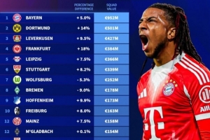 德甲球队身价榜:拜仁以9.52亿欧高居榜首,多特蒙德5.01亿欧位列次席