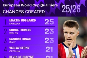 24直播网讯 据Squawka统计,挪威球星厄德高以25次创造机会,成为本届欧洲世预赛机会创造王。他领先于威尔士的索尔巴-托马斯和意大利的托纳利(均23次)。比利时核心德布劳内与捷克新星切尔尼以21次并列第五。
